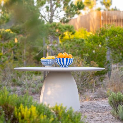 Make a bold design statement outdoors with the Dome Collection by Jati Kebon. Crafted from concrete reinforced with stone fiber, Dome combines raw strength with soft, sculptural curves for a look that is both architectural and refined. The round dining table seats six for al fresco gatherings, complemented by matching coffee and side tables to create a cohesive minimalist setting. Weather-resistant and durable, Dome elevates terraces, patios and gardens with natural texture, timeless design and lasting elegance.