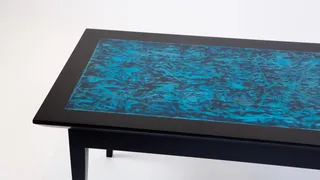 Keywords: designer furniture, OSB wood, colored decorative panel, French handcrafted table, polychromy, material innovation, high-end furniture, interior decoration, artisan craftsmanship Brittany, French contemporary design.