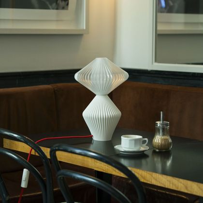 We’re mesmerized by its clear reference to lanterns and origami, playful and soothing, which contrasts beautifully with its retro vibe and geometric lines. The best part: its colorful Italian cotton cord, like the cherry on top. Marie-Lee was designed and crafted in our Montmartre workshop using recycled plastic and corn starch, and above all, a whole lot of love <3.