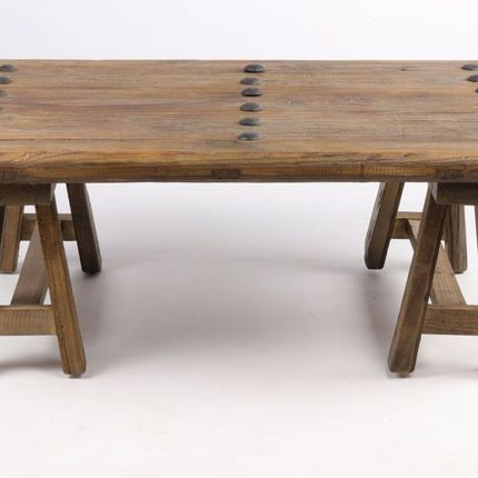 Industrial vintage trestle coffee table in recycled wood, 110 cm