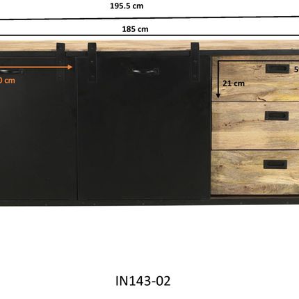 Industrial buffet wood and iron, sliding door, 3 drawers, 195 cm