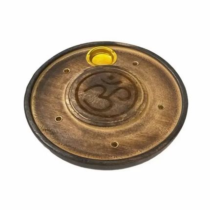 Chiseled Round Wooden Incense Holder Om 10cm x10