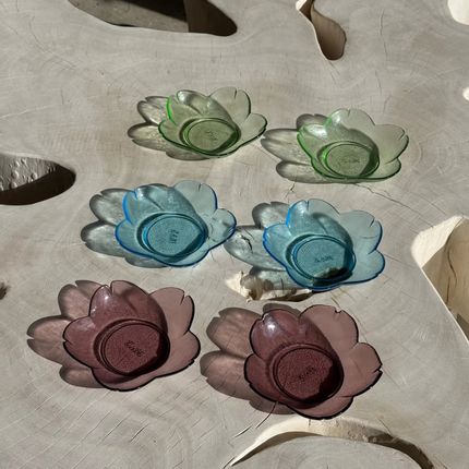 6 vintage flower-shaped cups, XVM brand below: 2 purple, 2 green, 2 blue