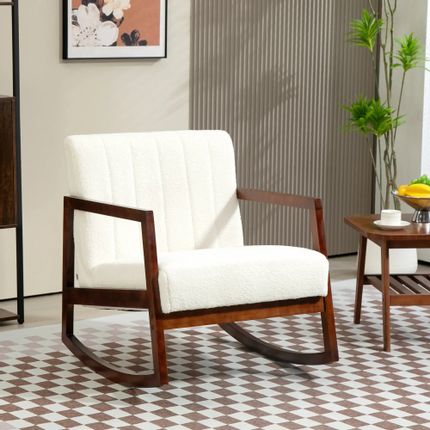 Rocking lounge chair in rubberwood with cream curly wool effect