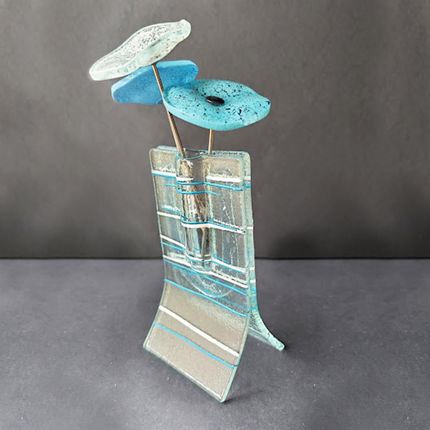 Small 8X13 Cm Striped Vase with 3 Small Flowers In L.Blue-White