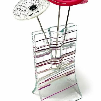 Small transparent 8x13 cm vase with fuscia-white-violet stripes and with 3 small flowers