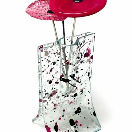 Small transparent 8x13 cm fuscia-white-black spotty vase with 3 small flowers