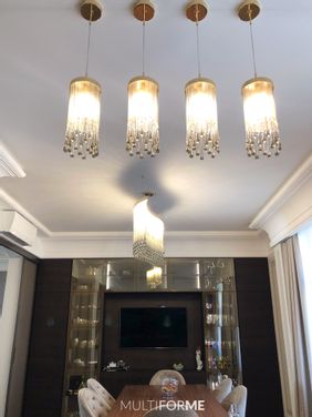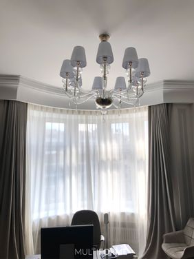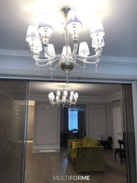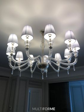 The furniture and the lighting for this flat were selected by design bureau Desart Decor who accurately chose the chandeliers among the collection Progressive and Timeless by MULTIFORME® lighting, in order to enhance the furniture of this apartment. The flat is very comfortable, with refined furniture in the shades of black, green and brown. The design chandelier for the kitchen and for the dining table chosen by the designer, does not only decorate creating a pleasant atmosphere, but it also lights up properly this important area of the flat. The contemporary chandelier and the suspension lamps of the Dancer collection used for this project are in grey glass, with golden crystals and golden fixture. Dancer is a cascade of glass elements: thin glass foils, drop-shaped elements and Swarovski®, glass elements give volume to this lighting product, entirely hand-made. The suspension lamp belongs to the collection Progressive, which gathers contemporary, glass chandeliers of design by MULTIFORME®. The living room is characterised by classical style and the main colours are light grey and white. For this room, the designer chose Palladium chandeliers with 9 and 12 arms in gold metal finishing and clear body with lampshades in white plissé fabric. Palladium is realized in free hand-blown glass, and it is characterized by the simplicity of its soft forms and for the suffused light guaranteed by the lampshades. This chandelier belongs to the Timeless collection which gathers all the classical Venetian chandeliers and that represents huge lighting products, even multilevel, with a wide possibility of customization in terms of glass colour, metal finishing of the fixture and of the handcrafted lampshades. These MULTIFORME® chandeliers, are characterized by a classical, but at the same time contemporary style and also for this project, they perfectly suit and give the right value to the surrounding space. The many possibilities of customization allow high-profile designers, such as Desart Decor, to express their imagination and to create unique and exclusive spaces.