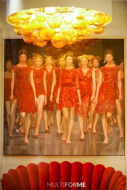 The Hotel Das Tyrol is a luxury hotel, full of artworks and of precious particulars situated in the heart of Vienna. It is characterised by a carefull reasearch in the choise of the finishings and the materials of the furnitures and walls (onyx, velvet red, tiles in golden leaf). Nothing is left to chance here, nothing is replaceable. Here the sophisticated iconic art meets contemporary art and creates a unique atmosphere where luxury as a matter of course. The Hotel Das Tyrol wants to offer an experience among art, culture and charming hospitality. The architect Mohammed Jarboui of Mods Lighting chose for the lobby and the reception Absolute of MULTIFORME® modern lamps in Murano handblown. These lighting artworks are customized and characterized by a big lampshade diameter 130 cm in cream color tissue with inside gold, that accomodates many artistic handblown glass spheres in different sizes and hung with invisble wires positioned at different heights, in amber colors and produced with rigadin and balloton technique and air bubbles. The effect is a play of lights and reflections, an elegant, artistic, light and magic chandelier suspended between dream and reality.