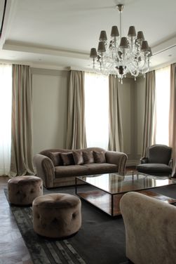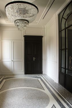 MULTIFORME® has collaborated with a design studio, for an important lighting design project for a private villa near Milan. MULTIFORME® has designed and produced the decorative lighting products for this project. The lighting works realised for this project are magniloquent, mostly extra-large lighting works, they have been especially design for this project. The purpose of the interior designer has been that of preserving the original elegance of the building, and at the same time conferring a touch of timeless beauty. For this reason, an empire style chandelier has been choosen to lighten up the entrance hall. It is a custom empire style chandelier, with a metal structure and completely covered with crystal garlands. The empire style crystal chandelier has been the ideal solution to decorate the hall: the natural light that enters trhough the large glass window hits the crystal garlands, multiplying the reflections and enhancing their brightness.