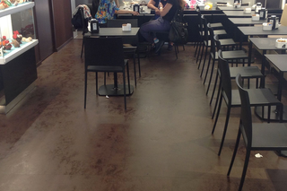 Realization of the flooring for the Ice-cream parlor C&G in Catania with low thickness porcelain stoneware slabs of the line Corten in the color moro. The size of the slabs used is 100×300 cm. The use of large-sized slabs allows a seamless and homogenous laying, perfect for a commercial realization because it visually amplifies the space. The high wear resistance makes the choice of porcelain stoneware the right one.
