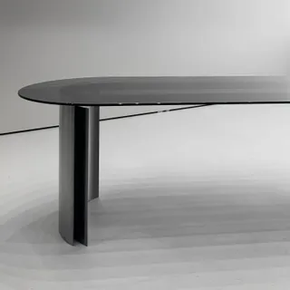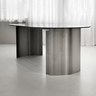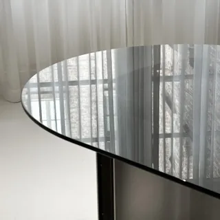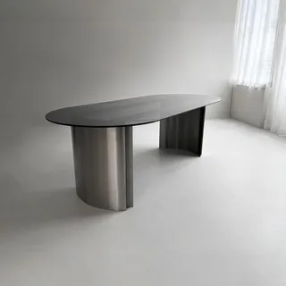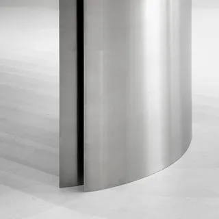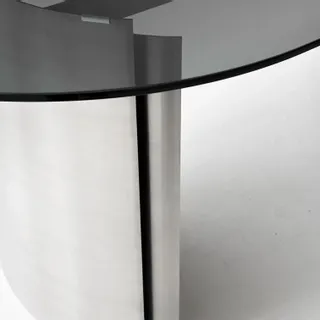 Dark gray tinted glass. Rounded elements in brushed stainless steel.
