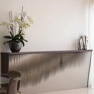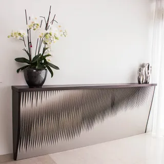 Designed and fabricated for a residence in Beirut, the piece serves to disguise a set of radiators without affecting their function. Made from twisted sheet metal, with a solid Oak top, the twisted waves change shape as you walk around the room creating a constant dialogue between movement and design. Stained Oak inlays serve to highlight accent the appearance of the countertops.