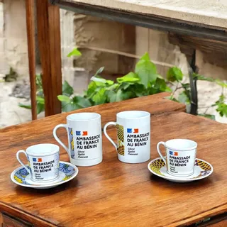 Mugs combining French identity and Beninese aesthetics to support the daily work of Embassy teams.