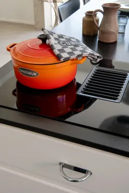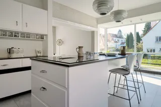 In the south of Brussels, within a house steeped in history, CUBEX delivers a rare project at the intersection of family legacy and contemporary design. The home was conceived as a family residence by Monique De Koninck, daughter of the original creator of CUBEX kitchens. Developed in close collaboration with architect Alain Delogne, the intention was clear: to honour the spirit of the place while meeting the expectations of modern living. The result is a C30 kitchen finished in “CIAMB” white, organised into three distinct sequences: a technical zone (water points, ovens, wine cellar and equipment), an elegant dishware buffet that discreetly conceals the heating system, and a central island with induction and integrated hood, extended by a generous high table for eight. A welcoming composition where past and present converse with quiet sophistication.