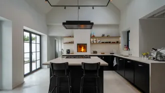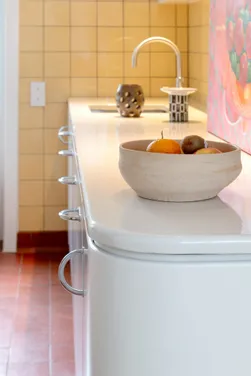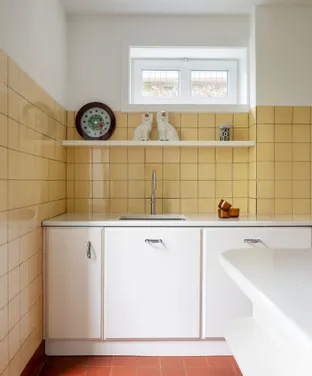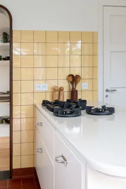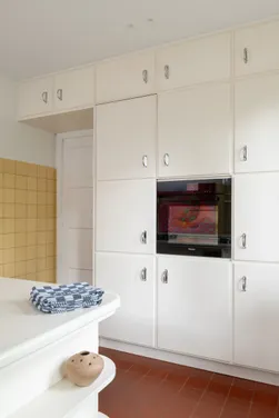 In a quiet neighbourhood near Antwerp, this 1936 residence embodies Belgian Art Deco at its most refined, where geometric balance meets exceptional craftsmanship. CUBEX approached the project with a clear intention: to honour the home’s original spirit without turning it into a period reconstruction. A historically faithful C30 kitchen unfolds in continuous curves, a fluid gesture that resonates with the existing architecture while maintaining a discreet, self-assured identity. Topped in glazed lava stone, the work surface adds a layer of distinction, recalling the elegance of 1930s interiors without ever slipping into pastiche. Materiality completes the composition: glossy white surfaces meet soft yellow wall tiles and a red terracotta floor, creating a nuanced palette where past and present respond to one another. Not a re-creation, but a resonance, letting architecture guide the gesture from within.