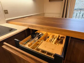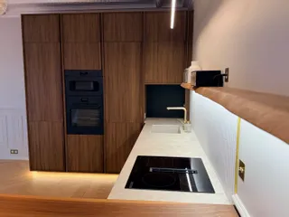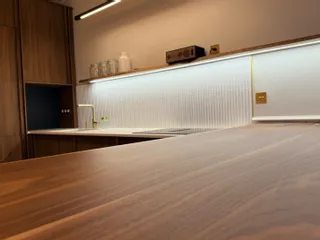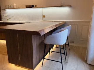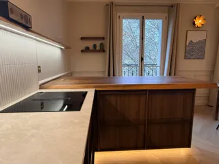 Custom project in walnut wood for a kitchen in Paris: - Table top - Shelf with LED light - Handles Ask for your custom project and we will send you a specific quotation.