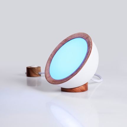 Impulse was born out of Luxion's constant research to use artificial light for human health and well-being. The specific spectrum of blue light helps the awakening process in the morning and improves the symptoms of seasonal affective disorder (SAD), bringing more energy and spirit in a natural way, which helps the user adjust the biological clock. Table lamp made of powder-painted steel and aluminum and with certified eucalyptus wood. 3 W LED - 300 lumens 2700k blue