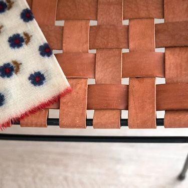 Woven bench steel and woven natural leather. Available in three sizes small, medium and double. It is a handmade bench in braided leather. Available in natural, brow, black, red and orange. This year we are launching the new off-white raw leather