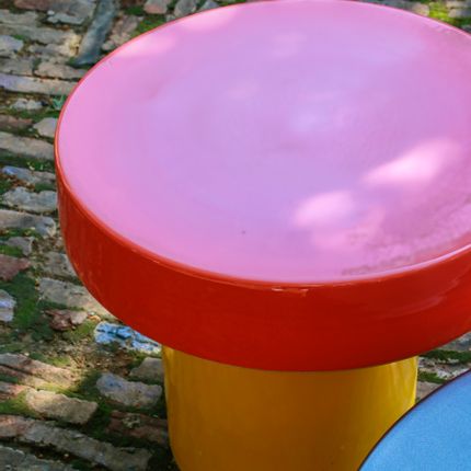 The CAP tables consist of two porcelain parts; a base and a table top. Each piece is thrown by hand and shows the blend between eastern and western cultures and handmade and industrial silhouettes. The idea for the tables came from using minimal forms that result in lively surfaces in glazed colors. Due to the fact that they are made from porcelain, they are very durable and resistant as well as colorful. This collection ranges from bistro tables to side and coffee tables and is suitable for indoor as well as outdoor use.
