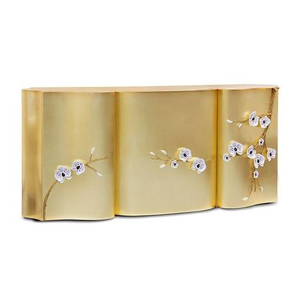 Inspired in high jewelry Honor is characterized by a sinuous shape distributed along a curvilinear 3 doors piece in gold leaf, adorned with metal orchid branches hand worked. This branches are ponctuated by swarovski crystals who enhance the jewelry status of the sideboard.