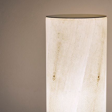 Polyethylene covered with faux shagreen - Top in golden brass thickness 2 mm or faux shagreen - 3 brass feet. 7W LED light source - 150 cm transparent electrical cable Dimensions: 16 x 36 cm or 22 x 10 cm