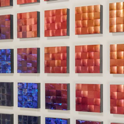 Made out of oxidized and treated copper, this wall object is not only transitioning in color, but also in form. Moving from a Midnight Dark Black Blue into Dusky Rose and Purple, Picking Up the Lusciously Curved Pieces Transitioning into Sunny Daylight. This 30 piece installation will be revealed at Maison et Objet next month in Paris, and can be ordered in different sizes. Due to the process a material, all works are different and unique.