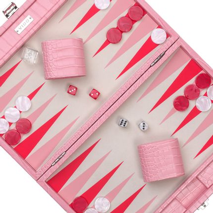 Vegan leather 15 inch backgammon set. This medium sized backgammon is a versatile option for passionate players. Whether at home or outside, roll the dice on a classic board! Our Pink Alligator backgammon set is carefully crafted with high-quality vegan leather, checkers and dice, along with our iconic VIDO double cube made of genuine crystal.Contents: vegan leather backgammon board, 30 29mm resin pawns, 30 29mm resin pawns, 30 29mm resin pawns, 4 resin dice, 4 resin dice, 1 crystal doubling cube, 2 dice cups, 1 pouch. game