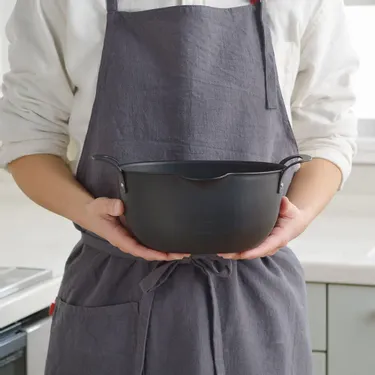 Aikata frying pot, made of black steel with a spout and three oil volume indications inside by Yoshikawa. Frequently used in the kitchen on a daily basis, this pot can be used to fry all kinds of foods such as chicken (Karaagé in Japanese), shrimps, asparagus, asparagus, croquettes, fish... Compatible with all stovetops including induction. Two cuffs are on the side which makes it easy to move the pot. Made in Niigata Japan.