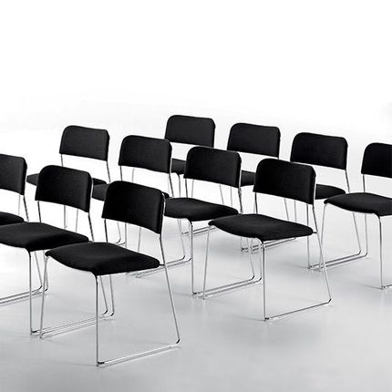 Stacking chair with beech plywood seat and back. Sled metal base. Available with upholstered seat and back. Available with removable anti-panic tablet arm with HPL black tablet. Ideal for: conference rooms, restaurants, cafes, bars. Optional: connecting ganging, transport dolly, floor metal alignment bracket, chrome frame, wengè, birch or zebrano plywood.