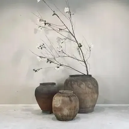 Antique rural pots from Chinese artisans, with a truly contemporary look, in rounded shapes with (or without) two small ear-shaped handles. The grey, matte texture of these one-of-a-kind pieces in varying sizes also differs from one pot to another.