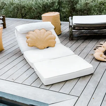 Handmade in France, in St Tropez. Its summer shape will plunge you into our marine universe. The raffia spirit, the star of summer, is also available for outdoor cushions: we love these decorative cushions\ "raffia effect\”: A bohemian chic spirit and an all-natural charm are found on your sofas, and in your outdoor spaces. This fabric is designed for outdoor and aquatic use. The visual of raffia, without its fragility. Also available in white or turquoise fabric, and in size XL