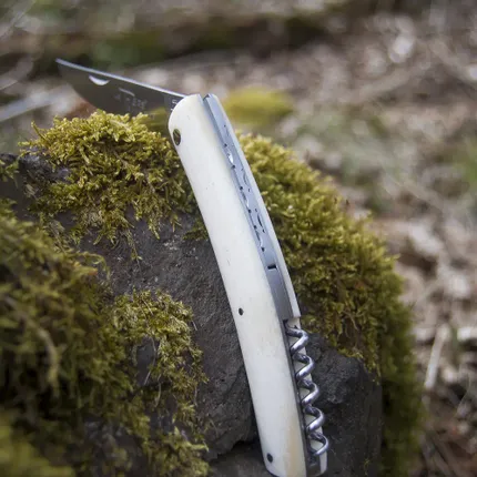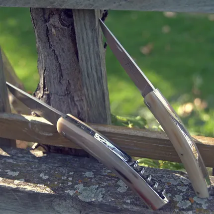 THE THIERS closing 9 cm or 11 cm. With or without corkscrew (11 cm). Sandvik hardened stainless steel blade. Thickness 2.5 mm (9 cm) and 3 mm (11 cm). Satin finish Horn or bone handle. Smooth blade. Hand guillochage. 100% made in France.