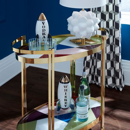 Chic, Graphique , Instant Classique . Bring a rich and moody Milan into any room new Torino Bar Cart’s signature palette. It features two glass shelves back-painted with a sharp fractal design and set in polished brass framework. With plenty of space to deck with decanters and mixing accoutrements, it’s a mobile libation station sure to elevate any at-home cocktail hour. Roll it out like you know your abode is the new It spot.