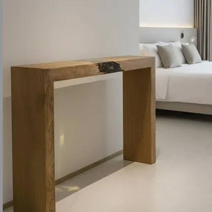 Integrating a console into your home is an opportunity to change your decorating habits and play on the Mix and Match trend. This console is made of 100% solid oak, from the most beautiful forest areas in Franche-Comté. Its raw and textured appearance and an aged finish give it character and warmth. The top is torn across the width, thus revealing the defibrated wood embedded in the transparent resin, a unique manufacturing process. This piece was entirely made in our workshop in accordance with tradition.