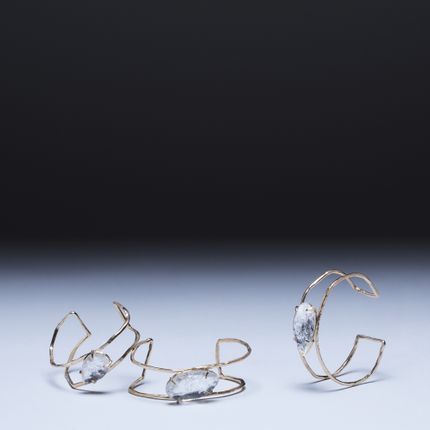 Marion Fillancq's unique pieces define her sculptural approach on bronze, mirror, and crystal. Simple rings and outstanding necklaces show a craft work, a unique signature in a ruff aesthetic. Let's appreciate again her bits of knapped mirror, and broken effects on 24K gold platted bronze. Hand made near Paris.