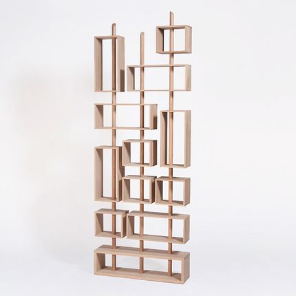11 niches slide and 7 rotate on 3 axes to form this modular library, according to your needs. DIMENSIONS H. 232CM X W. 82CM X D. 22CM - Interior dimensions: H. 19CM X W. 23CM X D. 18CM - Vertical rectangular niche: H. 45CM X D. 18CM - Horizontal rectangular niche: H. 19CM X W. 49CM X D. 18CM - Weight: 35kg. MATERIAL: 100% solid French oak from sustainably managed forests - MATT VARNISH FINISH. DELIVERY Delivered assembled - INSTALLATION - Elements to be adjusted to the height of your choice with the cleats provided - Made in France, Anjou