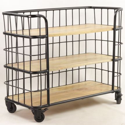 Console industrielle en métal et bois de manguier Cage, 3 étagères sur roulettes