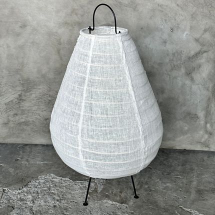 Petite lampe à poser japonisante en lin, métal et rotin en forme de goutte H50 D30