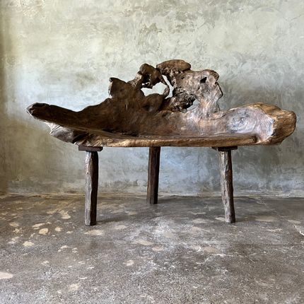 OFFICE OBJETS Grand banc en teck ancien tripode à dossier en large feuille de teck ajourée organique L1m35