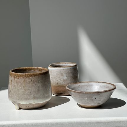 Réunion de trois pièces en céramique : tasse glacée, petite coupelle et petite tasse