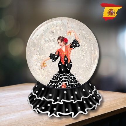 Boule à Neige LED – Danseuse Flamenco en Robe Noire (LED Blanc Chaud) – Minuterie & Option DC