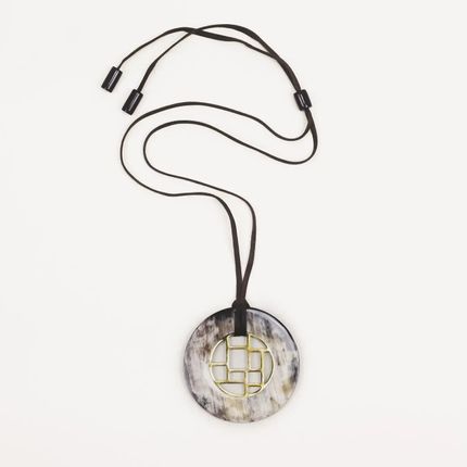 Pendentif damier laiton cerclé en corne noire marbrée