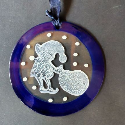 Décoration en verre représentant un elfe bleu peint à la main avec un sac