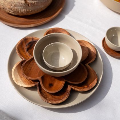Rien de tel que de profiter d'une belle journée de printemps au grand air. La table est dressée avec du pain frais, une salade colorée et des fruits juteux et colorés. Les assiettes fleuries et la coupe à fruits unique, réalisées artisanalement en bois d'acacia, apportent une élégance naturelle à l'ensemble. Les bols et assiettes Rutunda, avec leur douce finition en argile couleur sable, rehaussent cette ambiance.