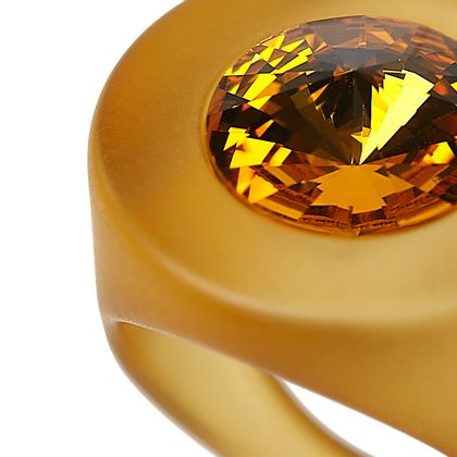 Un cristal rond à facettes est inséré dans la matière comme en suspension. La lumière et le volume du Plexiglas rencontre l'éclat du cristal.