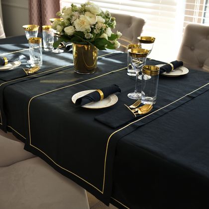 La collection Royal Black Goldenline est une signature de luxe intemporel et d’élégance audacieuse. Le noir profond rencontre des détails dorés raffinés pour créer une table spectaculaire au fort attrait boutique. Pensée comme une gamme coordonnée, la collection comprend nappes, chemins de table, sets de table, serviettes et accessoires textiles décoratifs pour une mise en scène cohérente. Cousue et finie avec soin dans nos ateliers en Pologne, elle est idéale pour concept stores, boutiques premium et intérieurs sophistiqués.