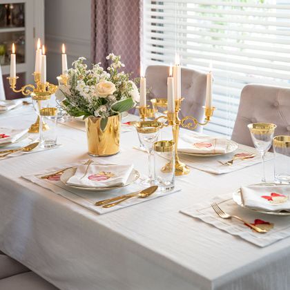 Les collections Panama & Mirha sont des classiques intemporels pour la mise en scène de la table. Des nappes 100% coton en blanc élégant (avec passepoil possible en or, blanc ou argent) et en beige chaleureux rappelant le lin (avec passepoil beige) créent une base naturelle et raffinée. Elles s’accordent parfaitement avec nos sets de table brodés Joyful Christmas, réalisés à la main dans les mêmes tissus que les nappes Panama blanche et Mirha beige. Combinez les broderies festives : canne du Père Noël avec gui ou cloche avec boule.