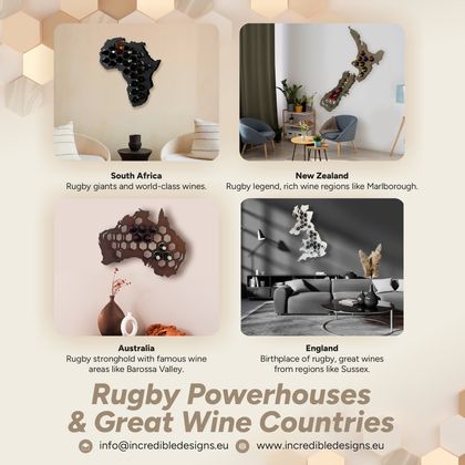 Afrique du Sud (porte-bouteilles Afrique) — Géants du rugby et vins de classe mondiale. Nouvelle-Zélande — Légende du rugby, régions viticoles riches comme Marlborough. Australie — Bastion du rugby avec des régions viticoles célèbres comme la Barossa Valley. Angleterre — Berceau du rugby, vins remarquables de régions comme Sussex.