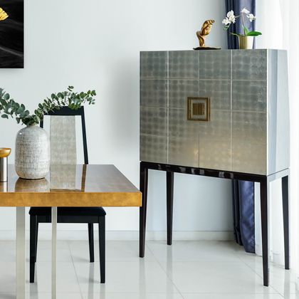 Affirmez votre style avec nos meubles bar laqués, où design épuré et fonctionnalité raffinée se conjuguent harmonieusement. Leur finition brillante crée une surface lumineuse, apporte une touche d'élégance instantanée à tout espace de réception. Déclinés en versions compacte, haute ou buffet, chaque meuble offre un espace de rangement généreux pour vos bouteilles, verres et accessoires, avec des fonctionnalités telles que des étagères réglables, des portes à fermeture amortie et des compartiments dissimulés. Nos meubles bar sont entièrement fabriqués à la main par des artisans qualifiés.